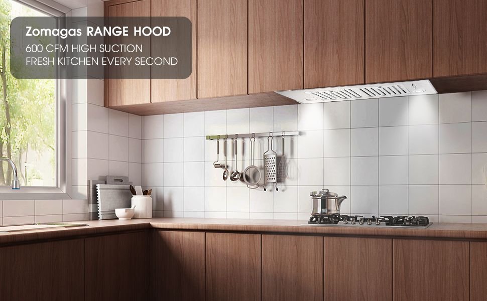 [High-performance Suction]Features 3 different speed fans you can operate with just a push button control panel; the 600CFM insert range hood is suitable for all kinds of cooking style efficiently removing large amounts of smoke and cooking odors in the kitchen