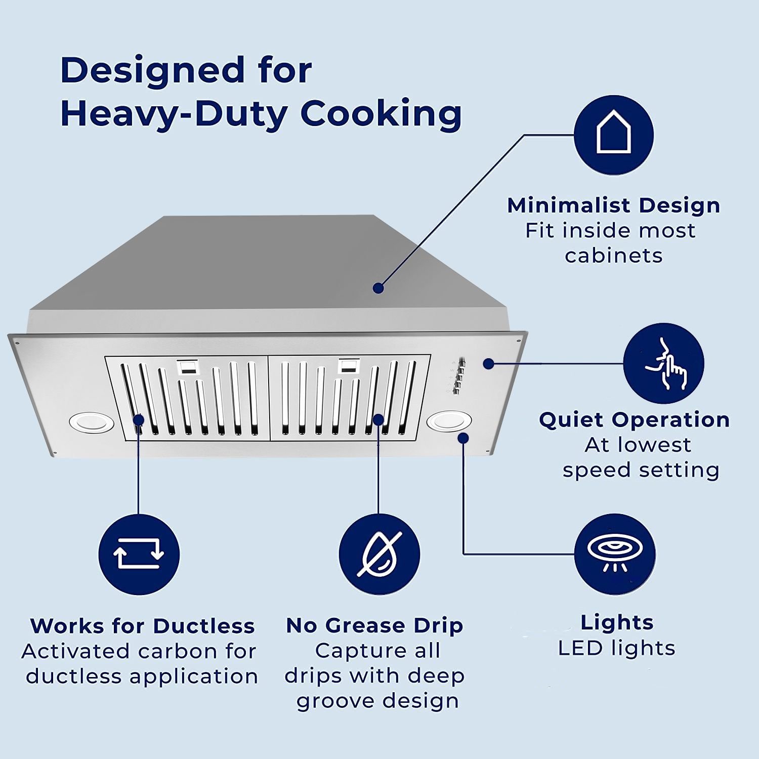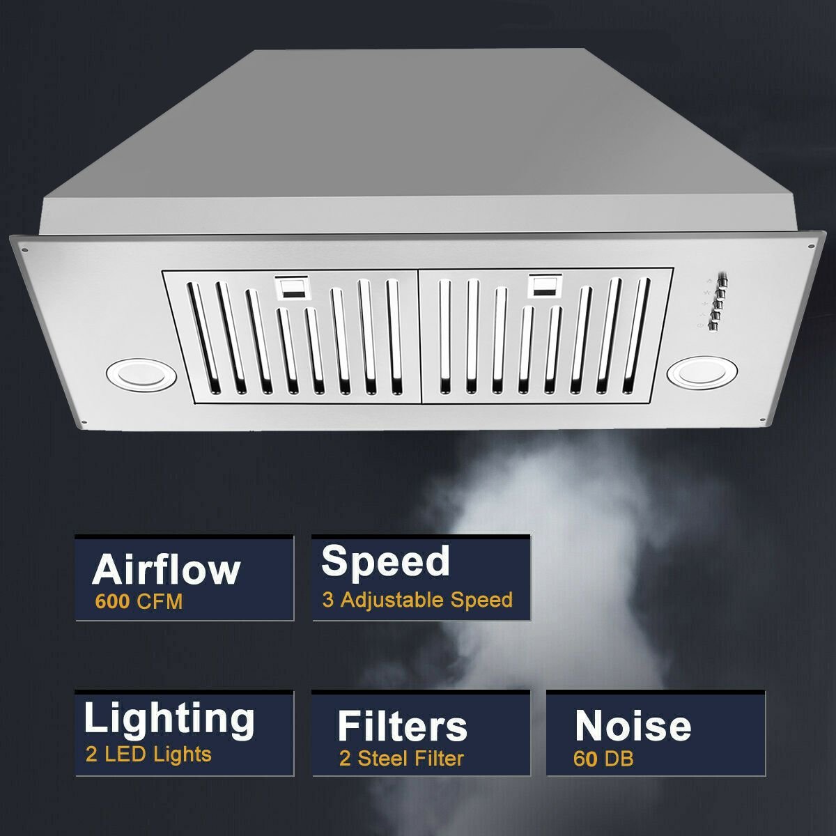 Home > 30 inch Insert Range Hood 600 CFM; Built-in Stainless Steel Range Hoods with Right Button Controls and Back LED Lights; Kitchen Hood for Over Stove;