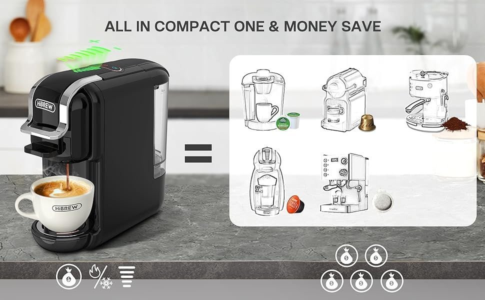 This versatile espresso machine comes with 5 different adapters and is compatible with Kcup capsules, Nes capsules, DG capsules, ESE coffee capsules and ground coffee, giving you more options for the enjoyment of making coffee at home.