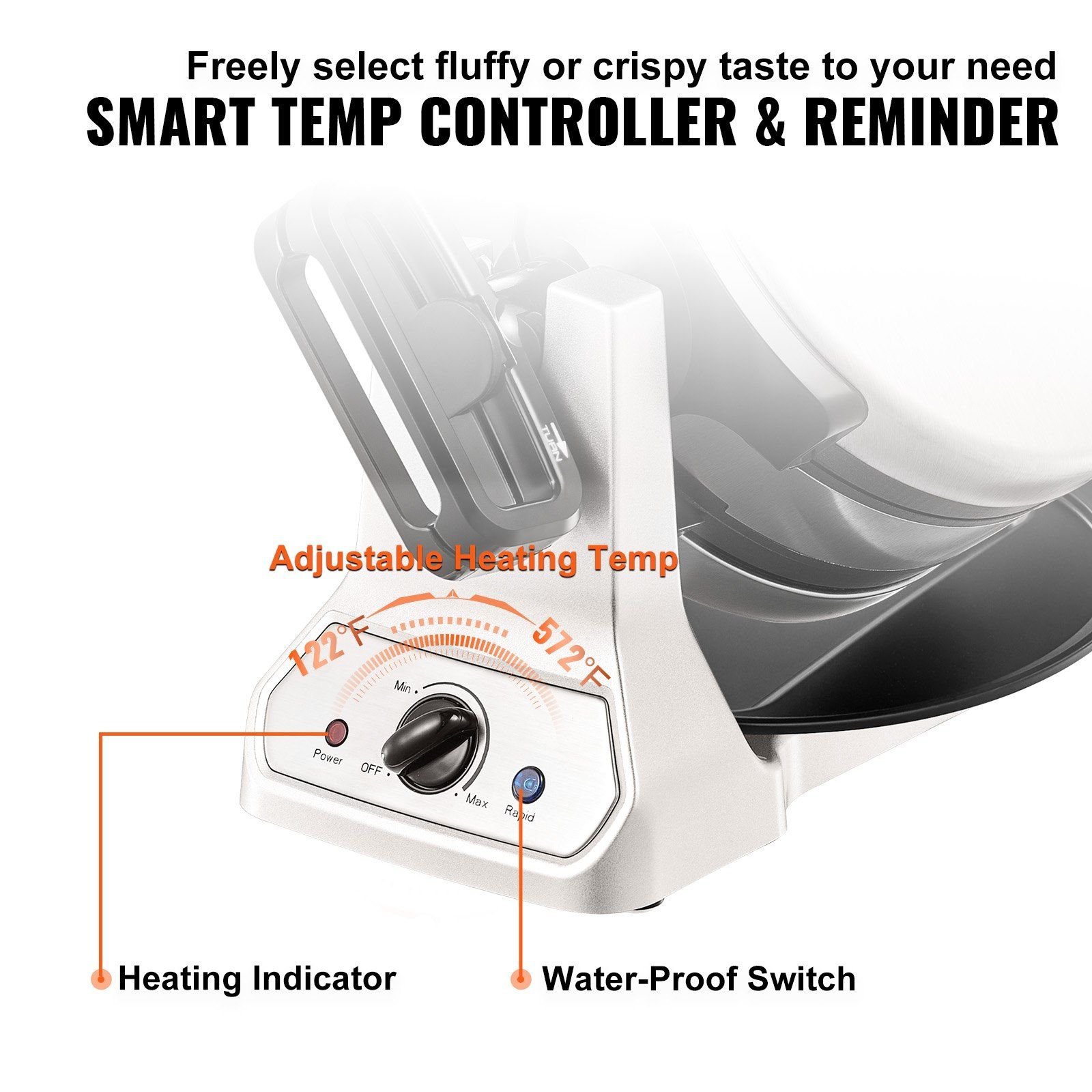 2.Humanized Functions: Designed with a temperature control knob (122-572°F / 50-300°C), this waffle iron can be adjusted to your demand. You can customize it to make your personalized waffles, whether you want a crispy or a fluffy taste. And it is easy to operate thanks to the individual ready and beep lights, which will remind you to add batter and indicate the waffles are cooked, no need to keep an eye on it all the time.