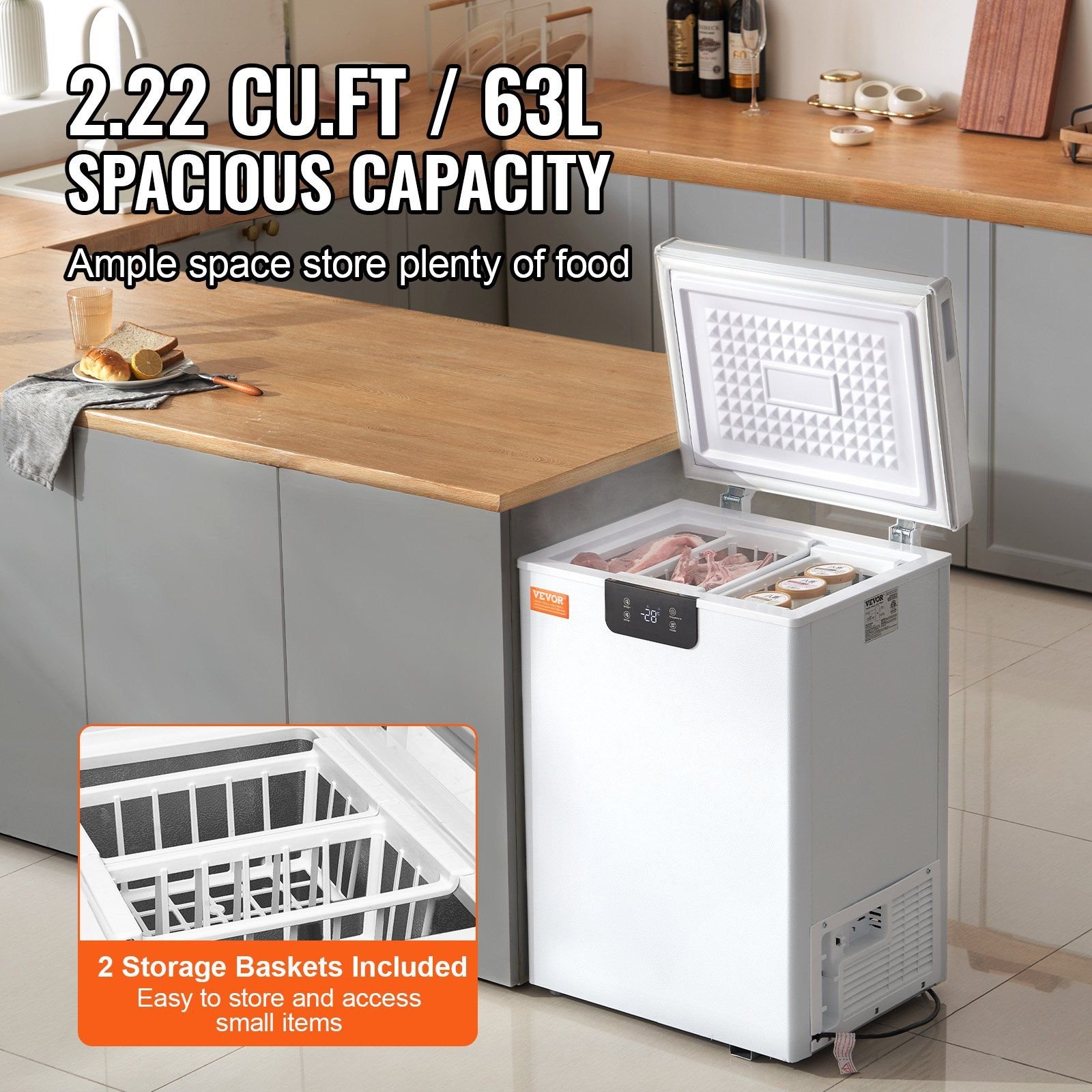 With 2.22 cu.ft capacity and 2 removable baskets, VEVOR chest freezer is perfect for storing everything from turkeys to pizzas and smaller items, ensuring ingredients stay fresh and cold for longer. Compact and space-saving, it offers extra storage for frozen goods while occupying minimal space.