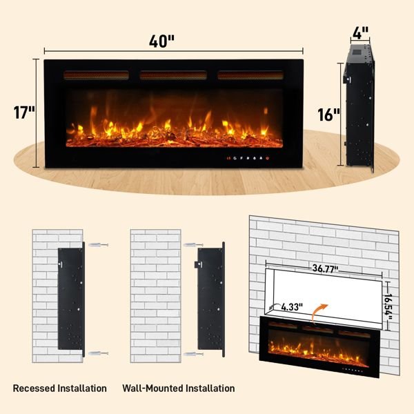 5. Three Mounting Options: The electric fireplace provides three adaptable installation options: wall-mounted, recessed, and freestanding. Whether you want to save space by mounting it on the wall, embed it into a custom-built unit, or simply use it as a standalone piece, this fireplace adapts to your preferences. Complete with easy-to-follow instructions and all the necessary hardware.